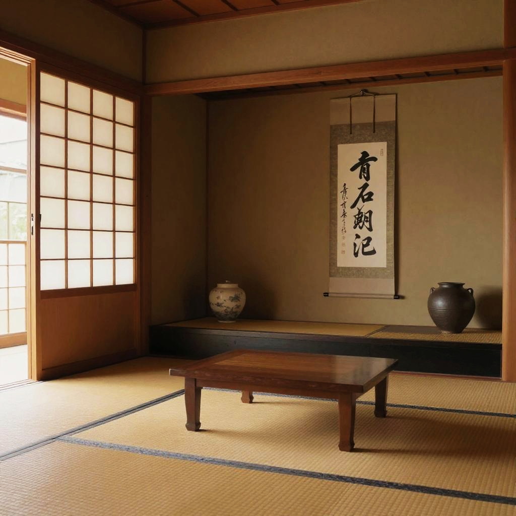 Interior of a Japanese traditional living room showcasing tatami mats, simple wooden furniture, sliding shoji doors with soft light filtering through, decorative calligraphy scroll on wall, pottery vases, and warm wood tones blending with natural daylight
