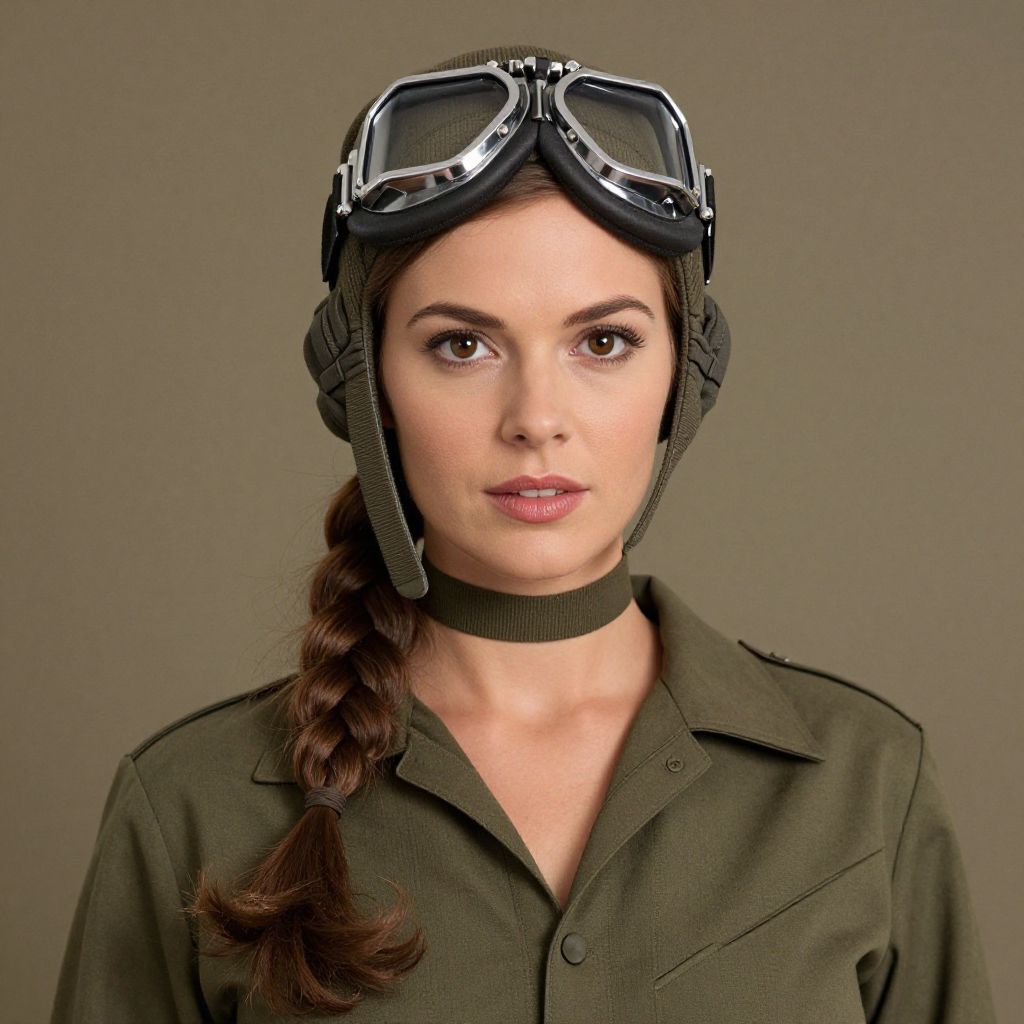 Photograph of a fair-skinned woman with brown eyes, braided hair, wearing aviator goggles, a green military-style shirt, and a black