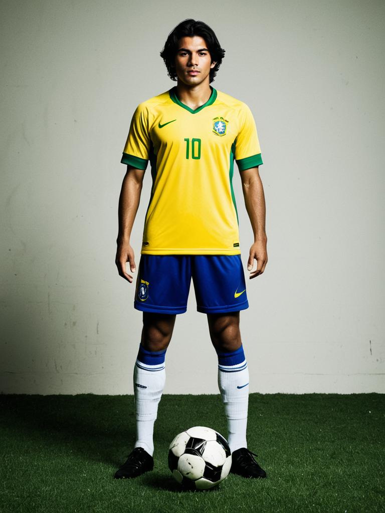 Brazilian soccer player, 1boy, male focus, soccer uniform, solo, sportswear, shorts, soccer, realistic, black hair, shirt, standing, socks
