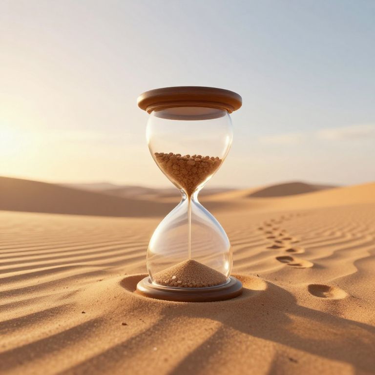 Photograph of a glass hourglass with sand, standing on golden sand dunes at sunset, casting shadows and footprints around.