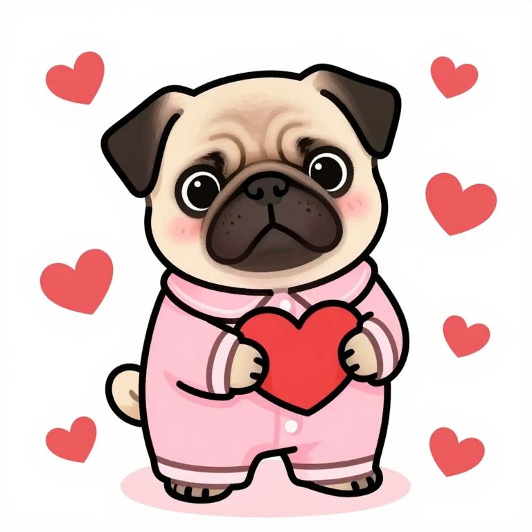 Digital drawing of an adorable pug with a cream-colored face and black ears and snout, wearing pink pajamas. The pug has large, expressive black eyes and is blushing with a small smile. It is holding a bright red heart in its small paws. Surrounding the pug are several red hearts, adding a romantic and cute vibe. The background is white, making the pug and hearts stand out. The style is cartoonish with thick black outlines and soft, vibrant colors, giving it a cute and endearing look.