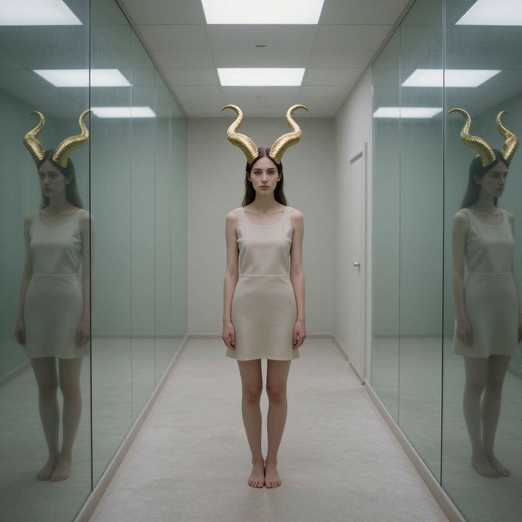 In a sterile, endless hallway, a woman stands before mirrors that reveal her reflection adorned with golden, serpentine horns, defying the boundaries between self and surreal transformation.