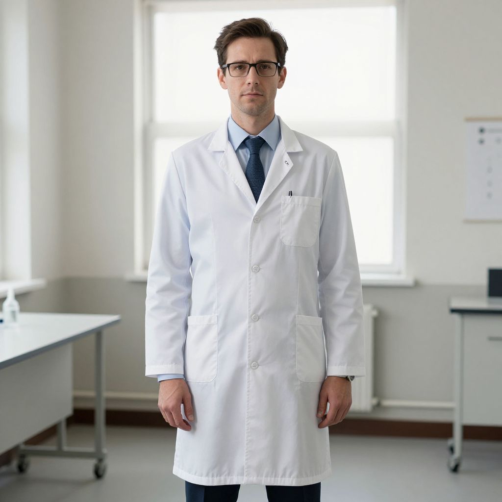 Photograph of a serious Caucasian male scientist with short brown hair, glasses, white lab coat, blue shirt, and tie, standing in a bright,