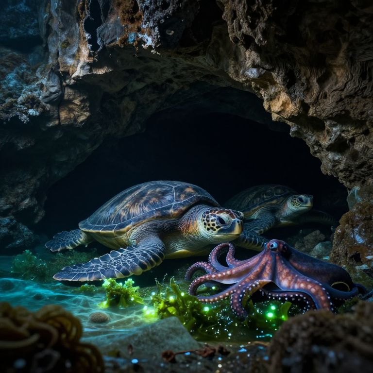 Photograph of a turtle and an octopus in a dark, rocky underwater cave. The turtle, with a textured, patterned shell and flippers, is positioned in the center, its head slightly raised. The octopus, with purple tentacles and glowing green bioluminescence, is to the right. The cave's rough, textured walls are illuminated by faint, blue-tinted light, highlighting the contrast between the dark cave and the vibrant, glowing marine life. The water at the cave entrance is clear, revealing small, colorful corals and rocks. The scene captures a serene, nocturnal underwater environment.