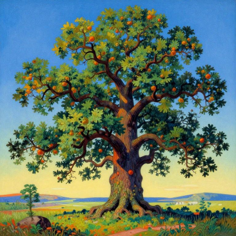 Vibrant digital painting of a large, lush orange tree with colorful oranges, set against a clear blue sky and green landscape.