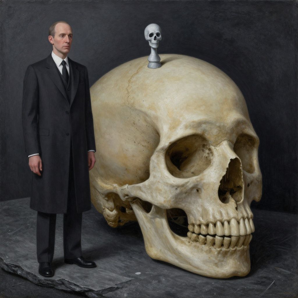 A digitally manipulated photograph features a bald, fair-skinned man in a black suit and tie standing to the left of a massive, pale yellow human skull. The skull is disproportionately large, with detailed teeth and eye sockets, and has a small, white, modern skull figurine perched on top. The background is a dark, textured gray, and the floor appears to be a rough, gray surface. The man's expression is neutral, and the overall composition creates a surreal, macabre atmosphere.
