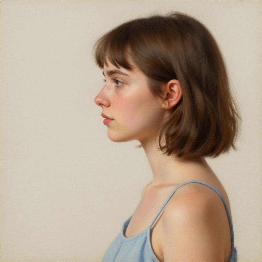A hyper-realistic digital illustration featuring a side-profile portrait of a young woman with short brown hair, wearing a light blue spaghetti strap top, rendered with meticulous attention to detail and soft, natural lighting, evoking the precision and texture reminiscent of an oil painting on linen.
