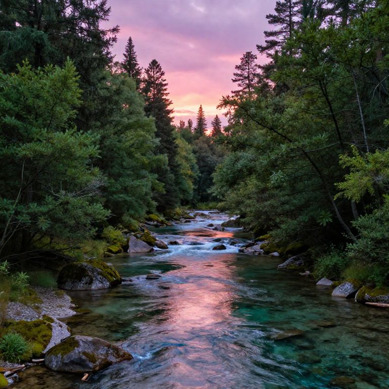 Bvs serene nature scene with a crystal-clear river flowing through a forest under a pink and purple sunset sky, gentle wildlife present, highly detailed foliage and water reflections, peaceful and vibrant tones