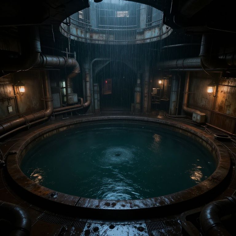 Cistern in a dystopian underground city, large circular structure filled with dark water, intricate pipe network, dim industrial lighting, rusted metal walls, moody atmosphere, rain dripping from ceiling, hyper-detailed cyberpunk environment