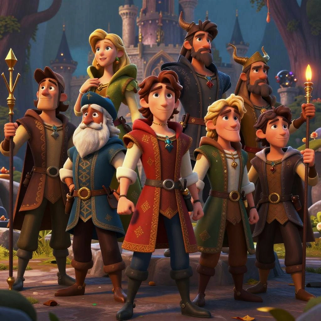 Make cartoon characters inspired by classic fairy tale heroes and villains, rich medieval designs, colorful costumes with intricate patterns, dramatic lighting, expressive faces showing emotions, dynamic compositions with enchanted castle and forest backgrounds.