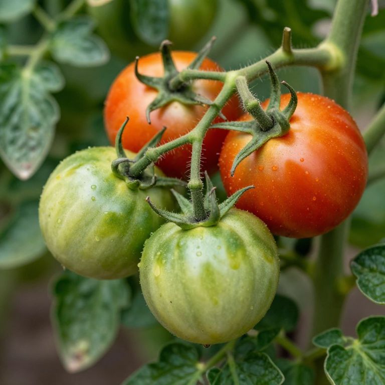 Close-up of unripe tomatoes on the vine, surrounded by healthy green leaves, soft natural lighting, shallow depth of field, rich detail in the surface texture and tiny hairs on the stems, photorealistic style