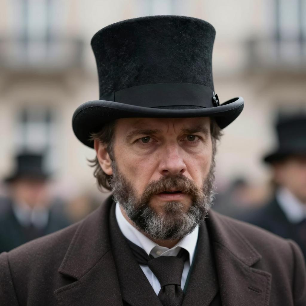 Five people pose on a wooden ship deck. Central figure is a bearded man wearing a black coat, three-piece suit, striped tie, and a black top hat, holding a metal jug. Beside him kneels a young girl with light skin, wearing a green jacket, brown cardigan, white shirt, red striped tie, and a black wide-brimmed hat. Three men stand in the background: one with tattoos and a navy t-shirt, one bald wearing a zip-up jacket, and one with a red headband and brown jacket. Ship's rigging and wooden details are visible, set against a cloudy sky.