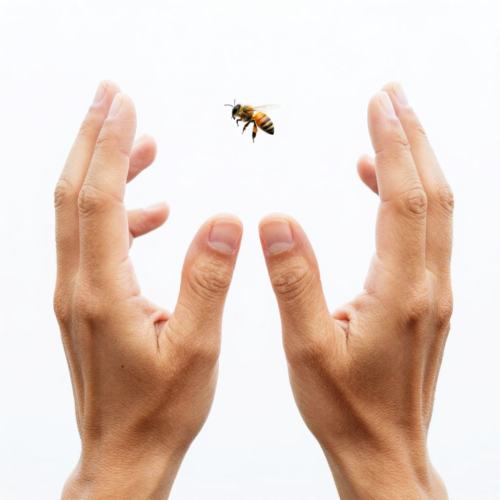A photograph of two light-skinned, slightly wrinkled hands with neatly trimmed nails, reaching up towards a small, black-and-yellow striped bee in mid-air. The background is completely white, making the hands and bee the focal point. The hands are positioned with fingers spread and touching each other at the knuckles, creating a gentle "V" shape. The bee is centered between the hands, adding a delicate, natural element to the composition.