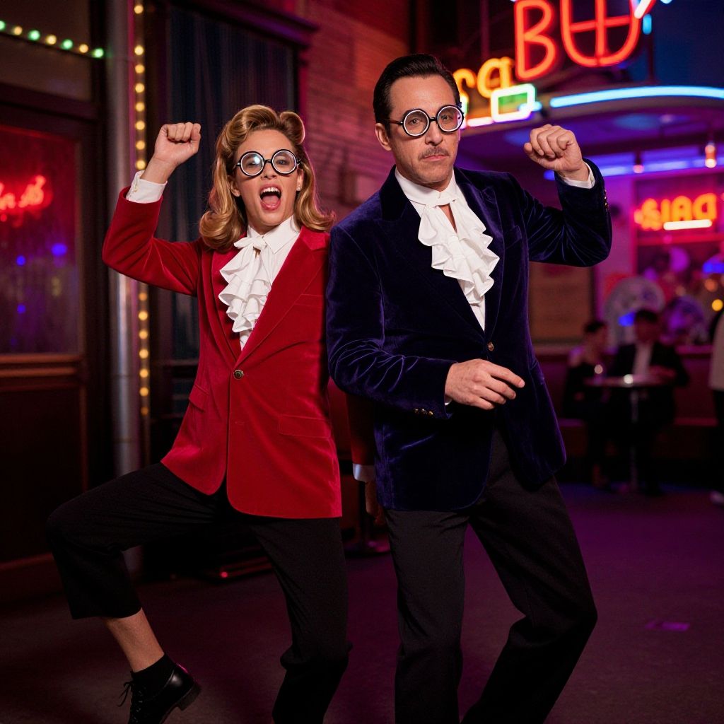 Austin Powers costume couple in a dynamic pose outside a 1960s jazz club, wearing velvet blazers, ruffled shirts, and round glasses, with a vibrant, psychedelic glow cast from neon signs, evoking a lively and cheeky retro atmosphere filled with energy and flair.