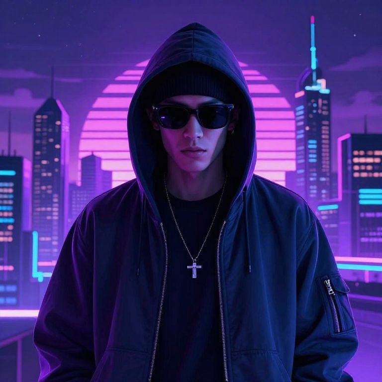 Phonk image featuring a mysterious figure wearing a hoodie and sunglasses, surrounded by vaporwave aesthetics, purple and blue neon hues, futuristic city skyline at dusk.