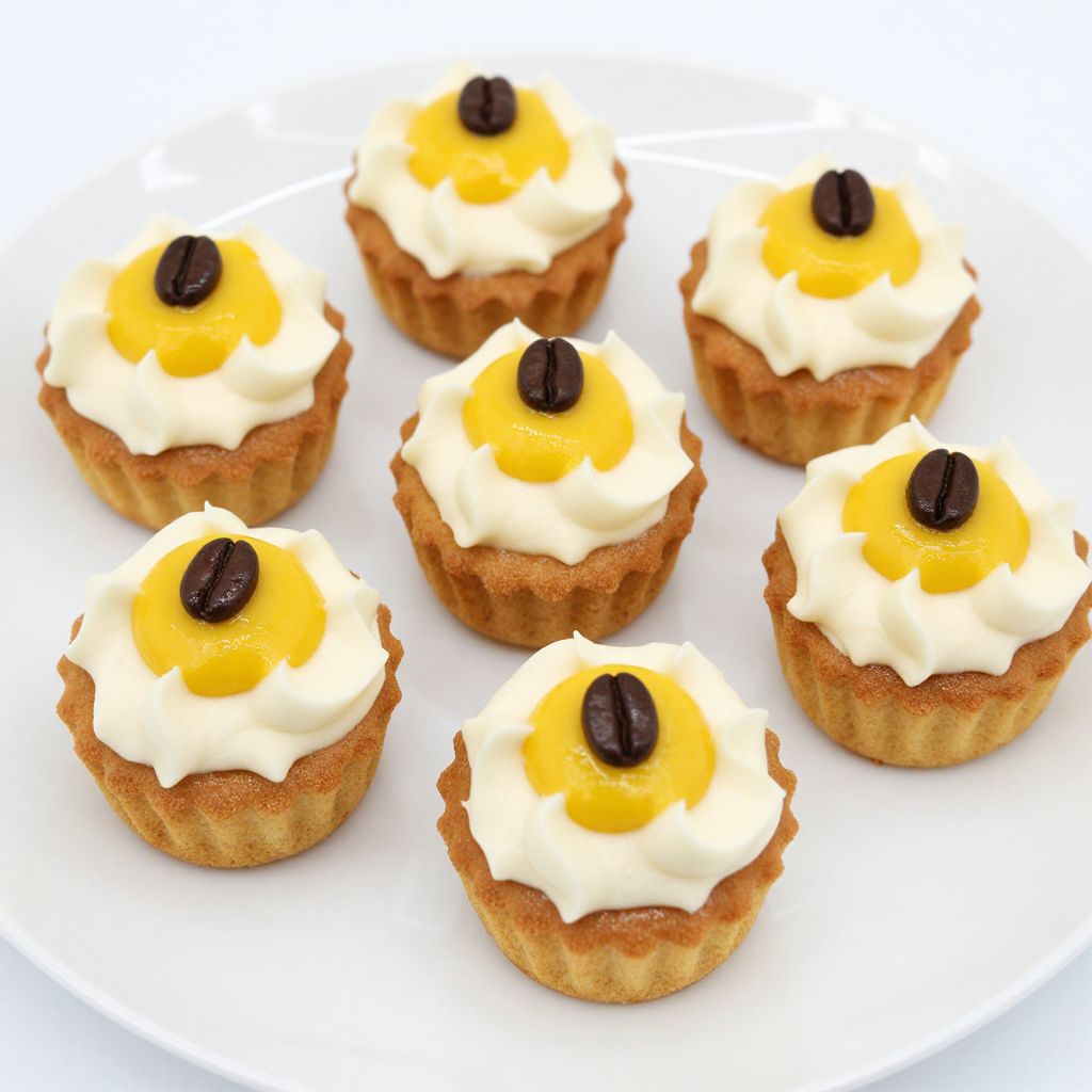 Six golden-brown mini cakes topped with creamy white frosting and vibrant yellow centers, each adorned with a chocolate coffee bean, elegantly arranged on a pristine white plate.