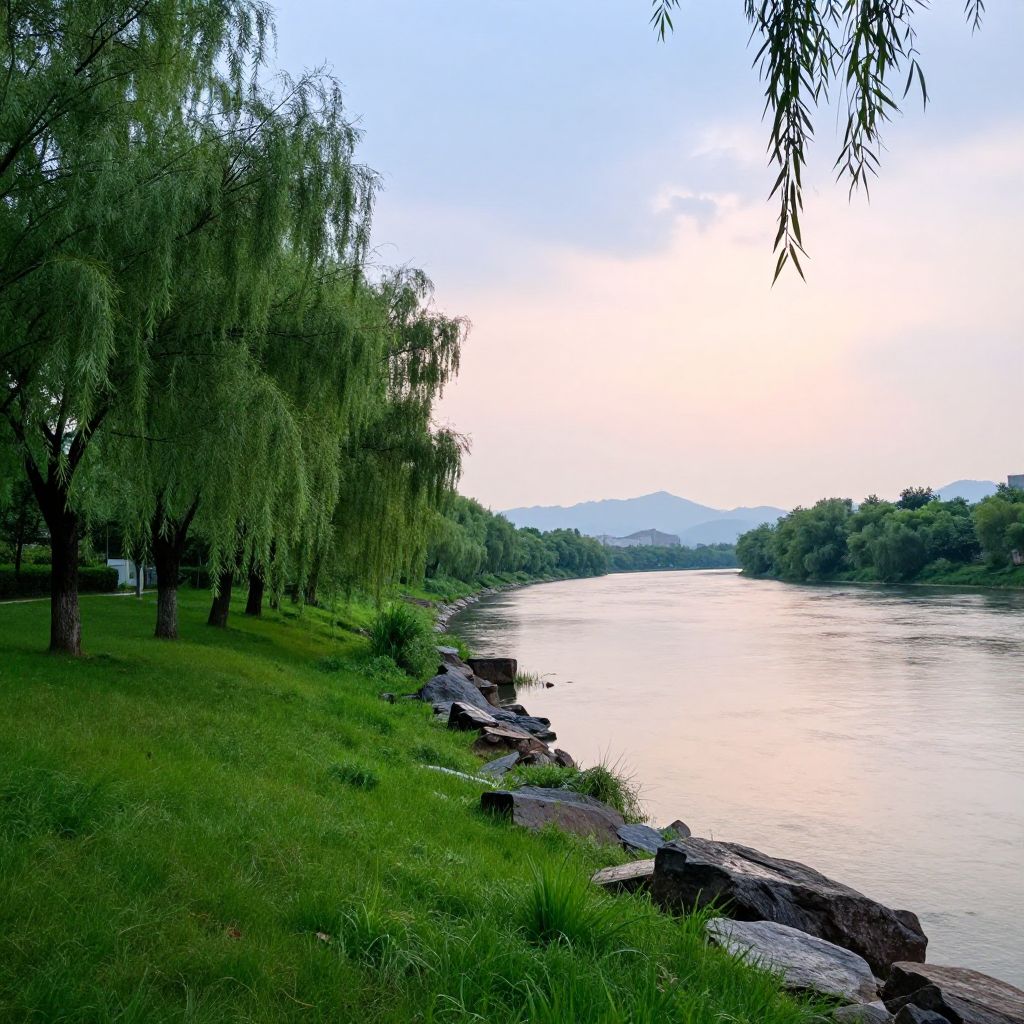 A serene riverbank lined with willow trees and rocky edges during late afternoon. The landscape features lush green grass and soft pastel tones under a light summer rain, with distant mountains and a partly cloudy sky.