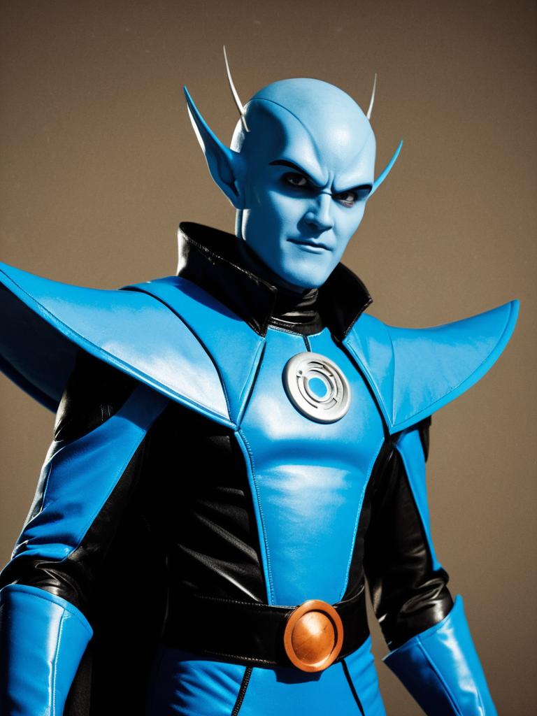Man in Megamind costume, editorial cosplay photo, photorealistic tones