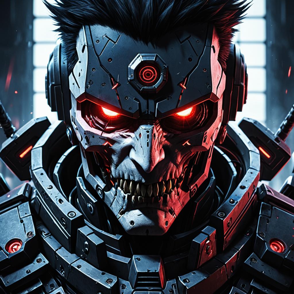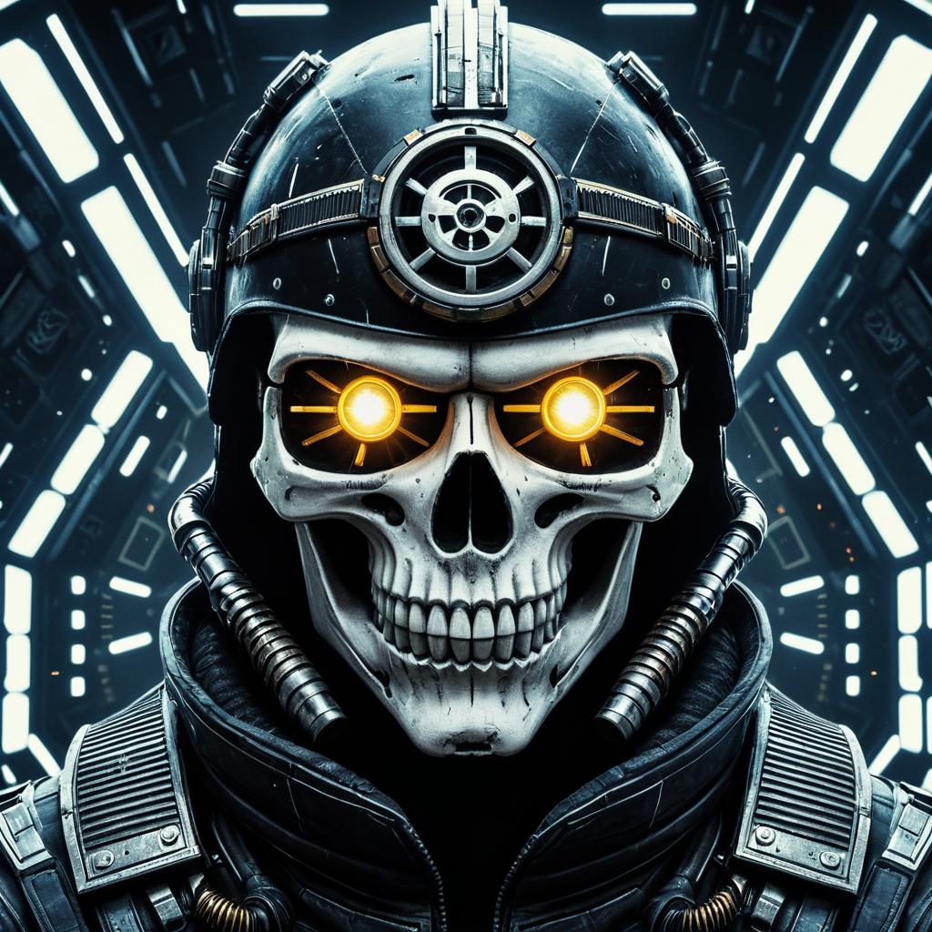Detailed close-up of a futuristic cyberpunk character wearing a retro-futuristic skull helmet with glowing yellow eyes, black armored suit, and high-tech breathing tubes against a symmetrical, illuminated sci-fi corridor background. The image features sharp focus and intricate mechanical details with a dark, interstellar atmosphere.