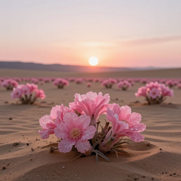 A surreal desert landscape bathed in the soft glow of a setting sun, where vibrant pink crystalline flowers carpet the sand, defying the barren expectations of a desert bloom.