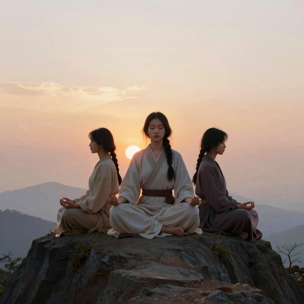 Stoic female characters meditating atop a mountain peak, serene and composed, flowing robes, soft sunrise colors, digital painting with high detail