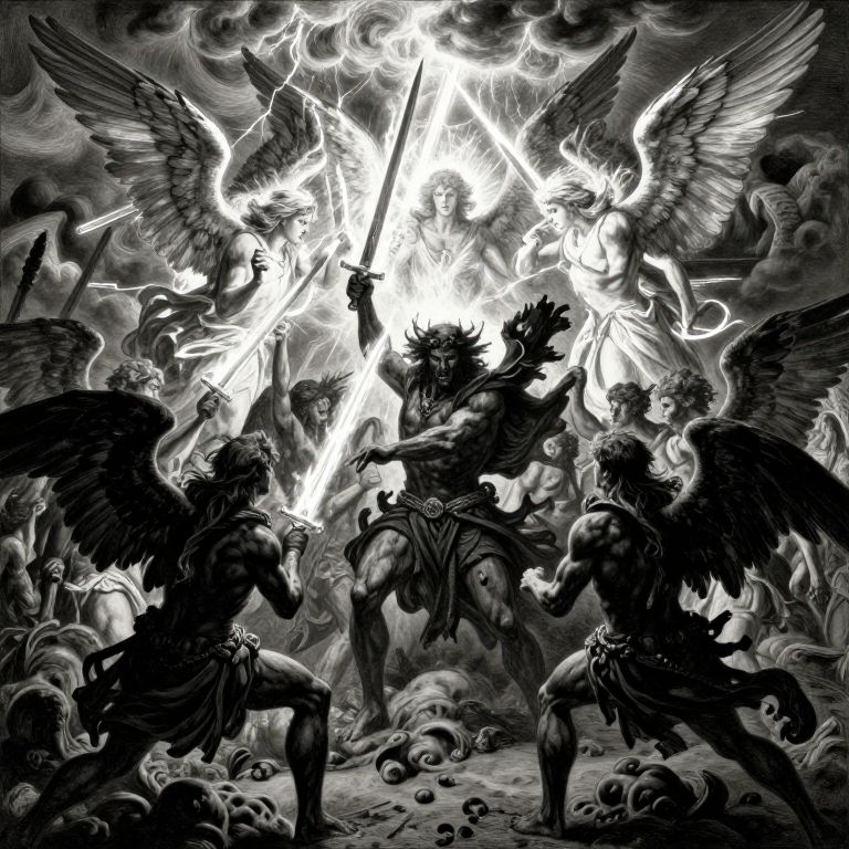 Monochrome digital drawing: Angelic warriors with wings clash against dark winged warriors, lightning illuminating chaotic sky, swords raised, skulls scattered below.