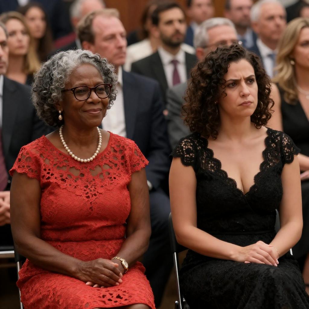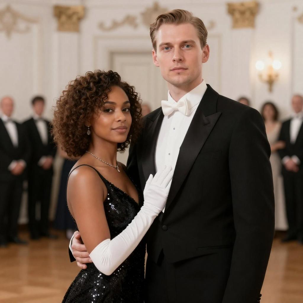 Photograph of three people standing on a paved path between tall hedges. An older white man in a black suit and tie with glasses stands in the center, arms behind his back. An older Black woman in a long, dark blue dress with a hood stands to his left. A younger white man in a black tuxedo with a bow tie stands to his right, holding a wooden cane. A large statue is visible in the background. The woman has a neutral expression, the older man is serious, and the younger man smiles.