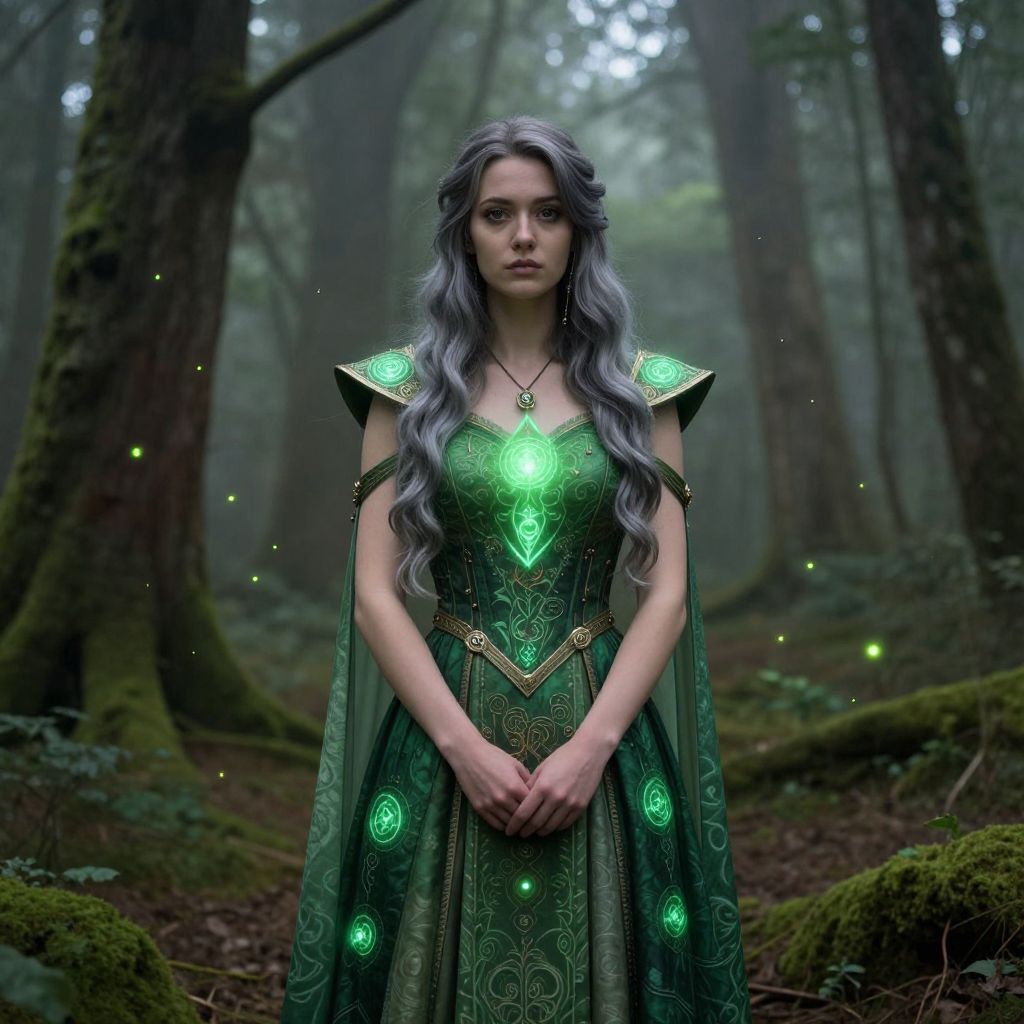 A photo-realistic CGI image of a young woman standing in a dense, misty forest. She has long, wavy gray hair and wears an elaborate green dress with glowing, mystical patterns and shoulder pads. The dress is adorned with circular green runes and intricate designs. Her hands are clasped in front of her. The forest background is filled with tall trees covered in moss, and small, glowing green fireflies float around her. The light filters through the trees, creating a magical, ethereal atmosphere.