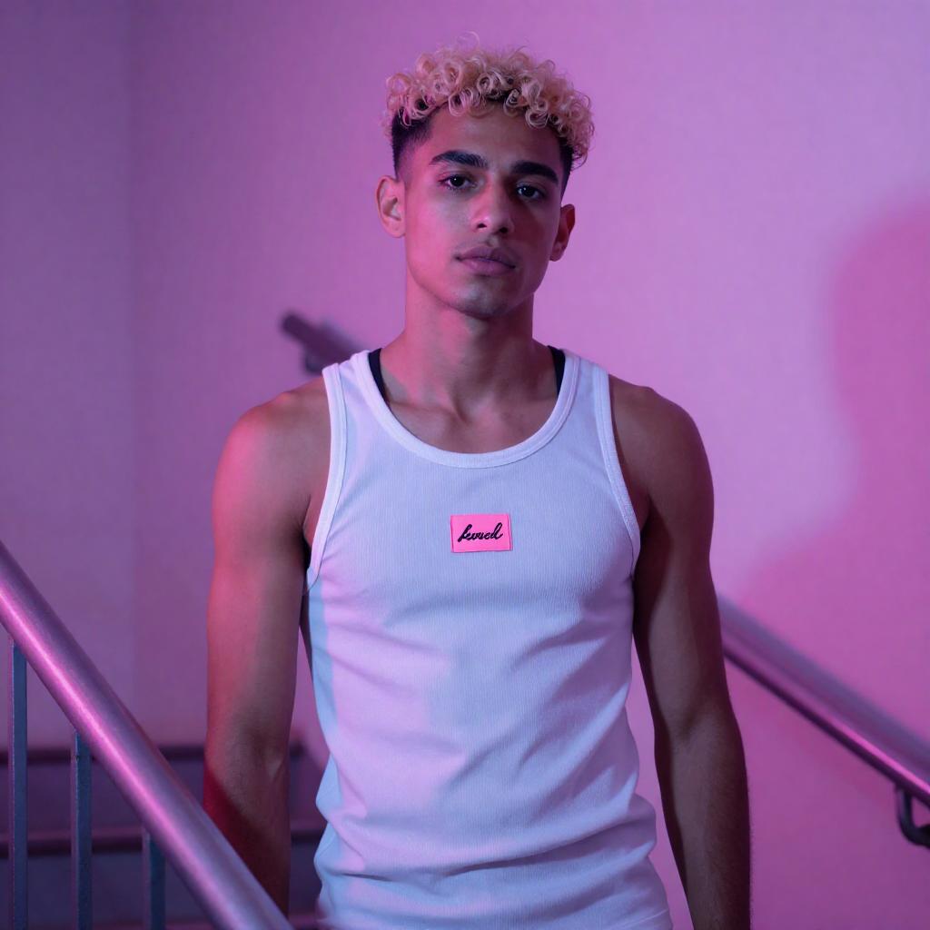 Photograph of a young man with curly, bleached blonde hair standing on a staircase. He wears a white tank top with "Pink Label" in black cursive, and a black tank top underneath. The background is bathed in pink and purple neon light, creating a vibrant, modern atmosphere. He looks directly at the camera with a neutral expression. A metal railing with colorful lights is in the foreground.
