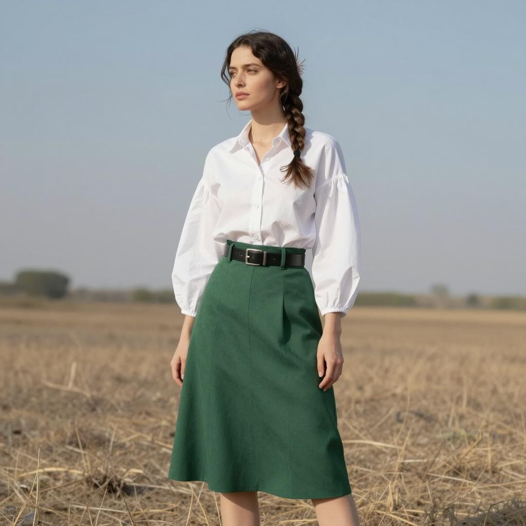 Cruella vil running costume, photograph of a woman standing in a dry, sunlit field, wearing a white button-up blouse with puffed sleeves and green high-waisted skirt, black belt, braided hair with a single feather, neutral expression, daytime, clear sky, casual style, natural light, soft shadows, minimal background, slightly blurred horizon, subtle contrast, realistic, fashion photography, modern vintage style