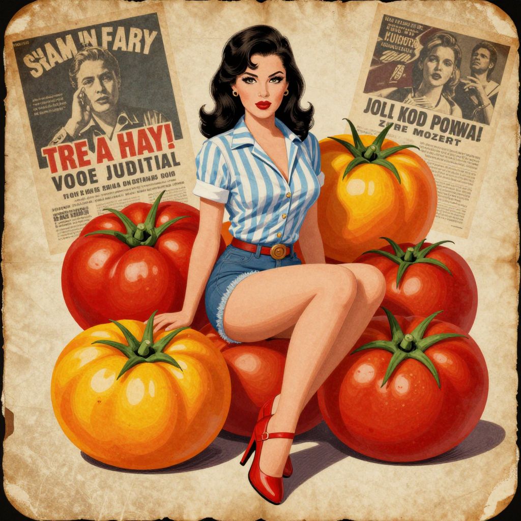 Digital illustration of a curvy, fair-skinned woman with black, wavy hair and red lipstick, sitting among large, vibrant red and orange tomatoes. She wears a blue and white striped shirt, denim shorts, and red high-heeled shoes. Behind her are two vintage-style movie posters: one for "Sam Farrell" with the tagline "TREASURE IN YOUR TOMATO JUICE," and another for "JOLLY JOKER PUNISHER." The background has a textured, beige, vintage paper effect. The overall style is reminiscent of 1950s pin-up art, with bold colors and sharp contrasts.