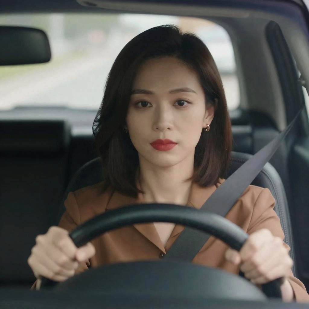Asian woman with short, wavy brown hair in a car, looking out the window to the left. She wears a blue turtleneck and black jacket. Blue car seat upholstery, blurry outdoor background, calm expression. Indoor car setting.