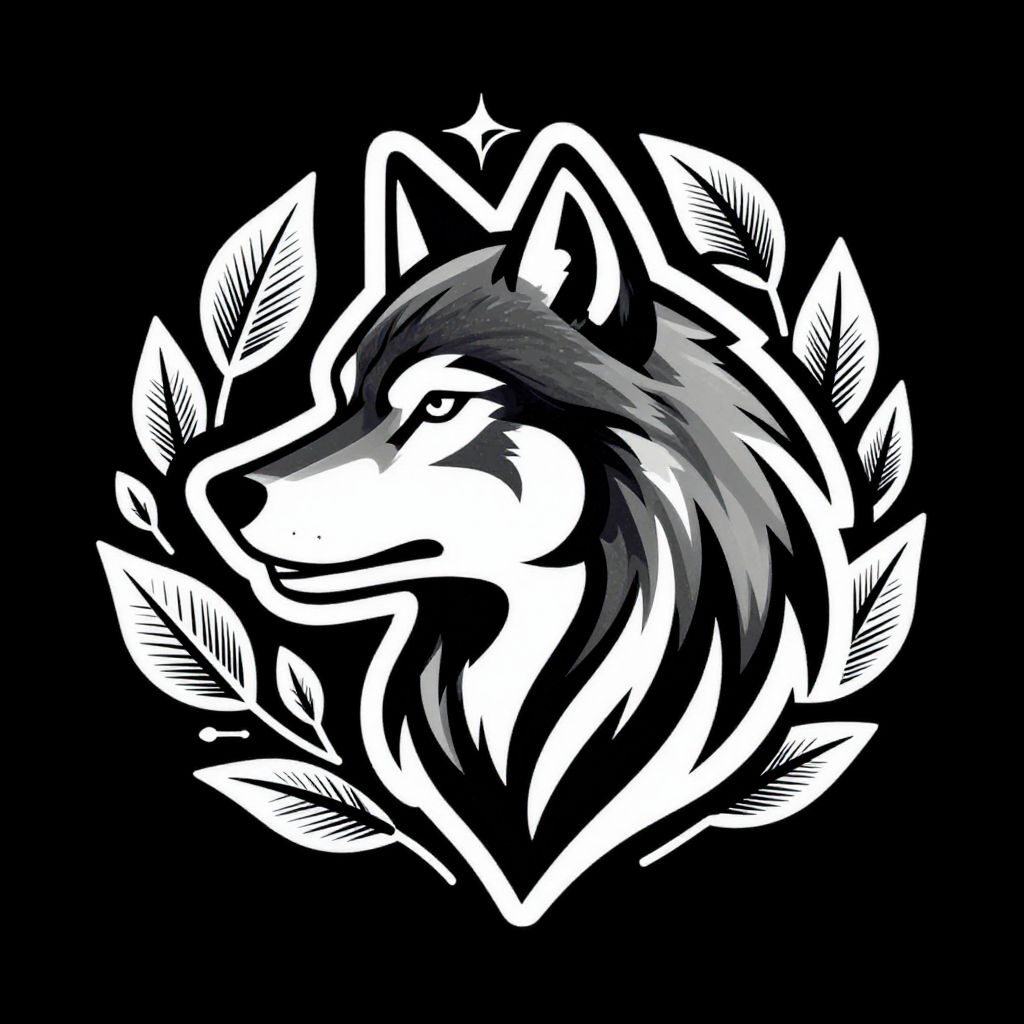 The image features a striking black and white logo of a wolf, rendered in a minimalist yet detailed style. The wolf's head is depicted in profile, with sharp, pointed ears and a sleek, flowing mane that extends down its neck and back. The wolf's face is characterized by a strong jawline and a slightly open mouth, giving it a fierce yet regal appearance. The background is a solid black, which contrasts sharply with the white outline of the wolf, making the design stand out prominently. Surrounding the wolf's head are delicate, leaf-like shapes that add a touch of nature and elegance to the overall composition. The leaves are intricately drawn, with varying sizes and orientations, creating a sense of depth and movement. The entire design is balanced and harmonious, with the wolf's head centrally positioned and the leaves flowing naturally around it, creating a cohesive and visually appealing image.