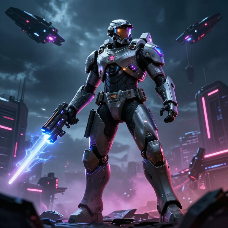 Sci fi soldier art featuring a futuristic armored warrior standing on a neon-lit battlefield, with glowing energy weapons and advanced cybernetic enhancements, under a dark, stormy sky filled with ominous spacecraft, detailed and highly dynamic composition.