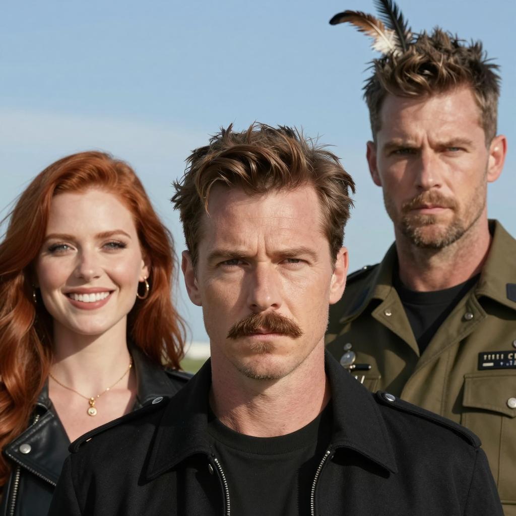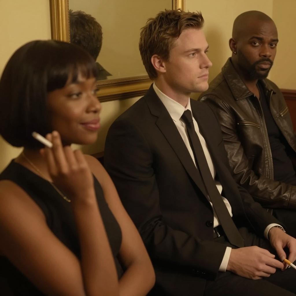 Photograph of four people. Blonde man in leather jacket, white shirt, center, looking forward. Dark-haired woman in blue jacket, right, leaning close, intense gaze. Man with brown hair, white shirt, right, brushing teeth, expression focused. Dark-skinned man with patterned jacket, left, partially obscured, serious expression. Blue background, indoor setting.