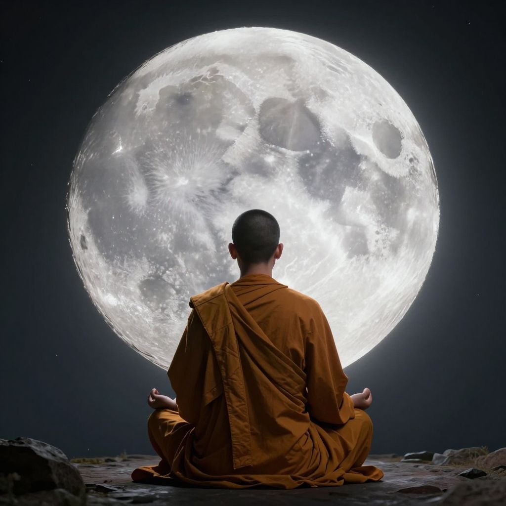 Clear ETH sign on the moon, back view of monk meditate under the moon, high detail, cinematic photography, sci-fi atmosphere