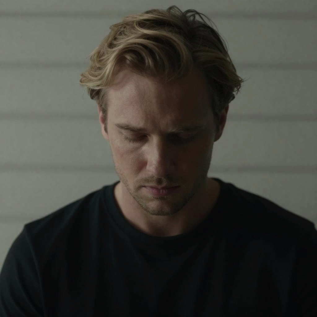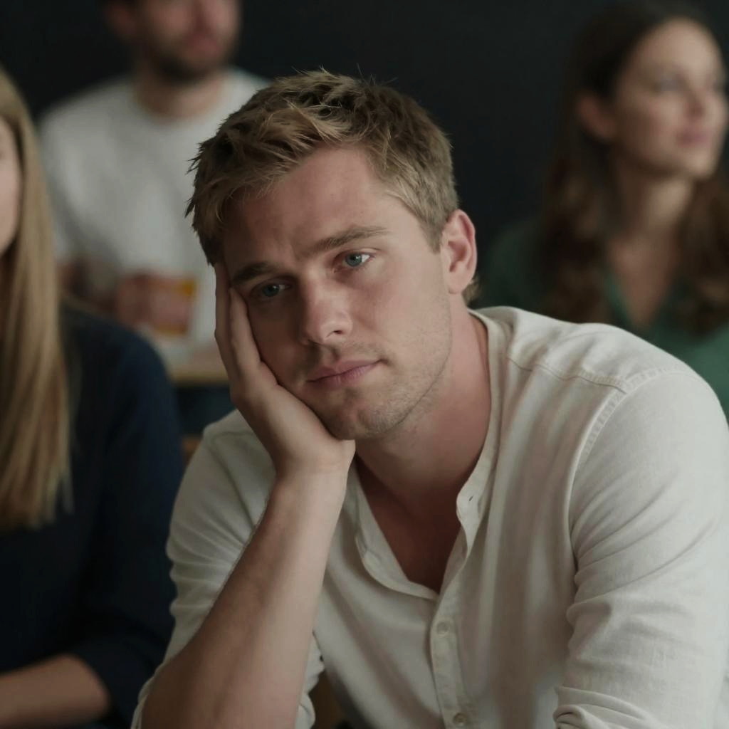 Photograph of a man with short blonde hair and blue eyes, resting his head on his hand, wearing a light-colored shirt. He has a pensive expression. Background includes several people, blurred, in a dimly lit setting. A woman with long brown hair and a green top is partially visible on the right. A person with long blonde hair is on the left. One person in the background holds a drink.