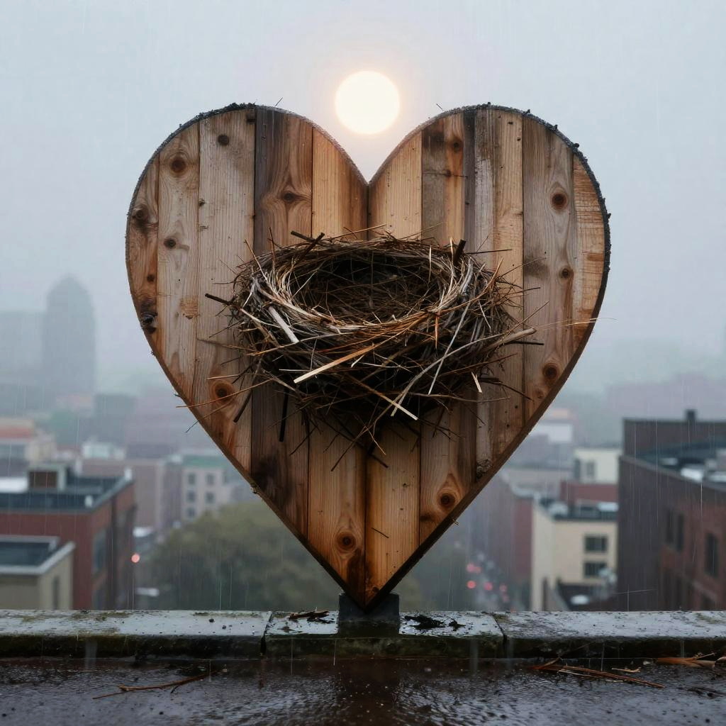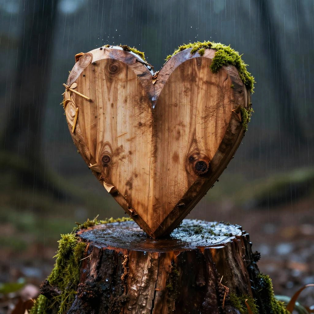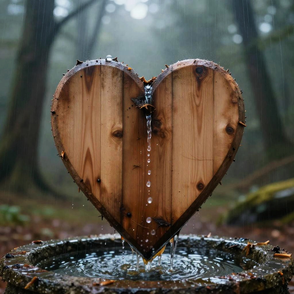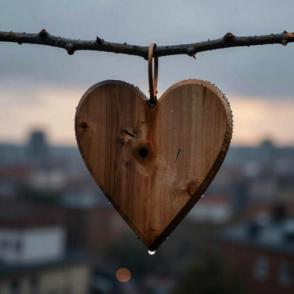 A wooden heart in the rain with a rusted padlock :: poignant, dramatic, mysterious :: geometric abstraction, rim light :: by M.C. Escher