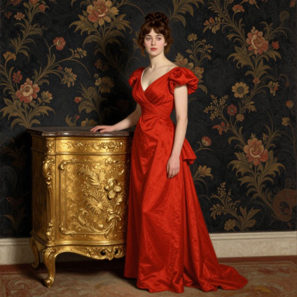 A digital illustration inspired by John William Waterhouse's style, depicting a woman in a vibrant red dress standing beside a ornate golden cabinet, set against a dark floral-patterned backdrop with a vintage aesthetic.