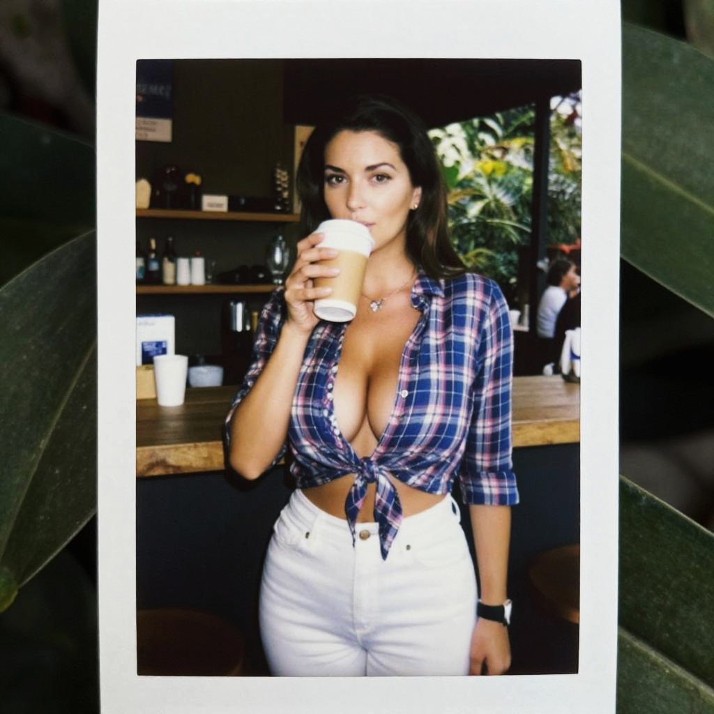 A toned woman in a casual plaid shirt in blue and pink, white slim-fit trousers, and a black wristwatch, captured in the visual style of instant film, enjoying a trendy coffee bar in a lush garden. Sexy. Pretty face and beаutiful eyes. Big breasts