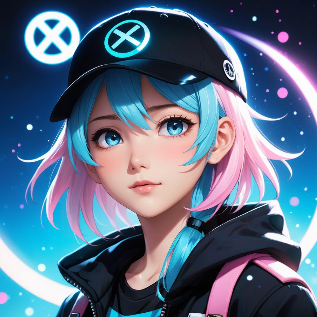 Close-up digital portrait of an anime-inspired young person with light blue and pink hair styled in a casual braid. The figure wears a black cap featuring a glowing circle and cross symbol, paired with a dark jacket and a light-colored shirt. Soft lighting highlights their detailed blue eyes and neutral expression, set against a background of a glowing halo-like light and small floating particles, emphasizing blue and pink tones.
