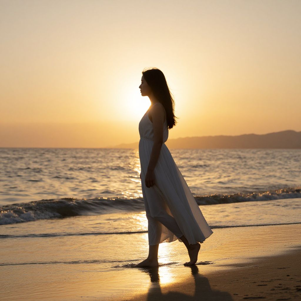 A woman in a flowing white gown walks barefoot along the shoreline, her silhouette bathed in the golden light of a serene sunset, embodying a profound sense of freedom and introspection as the gentle waves whisper tales of transience and eternity.