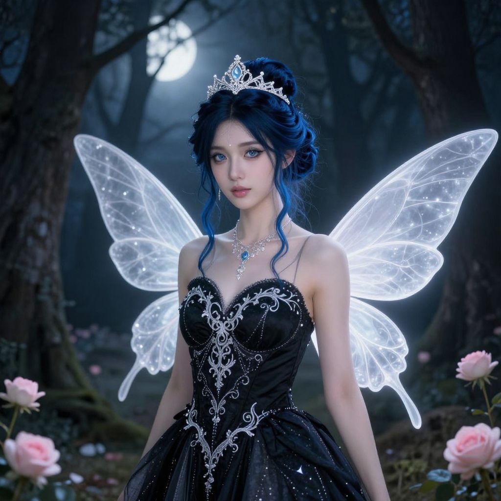 Photograph of a young woman with pale skin and striking blue hair styled in an updo, wearing a black, strapless, intricately embroidered gown with silver detailing. She has translucent, glowing fairy wings and a delicate silver tiara. Her blue eyes are wide and captivating. She stands in a dark, misty forest with tall trees and a full moon in the background. Pink roses are in the foreground. The overall atmosphere is ethereal and magical, with a focus on her fairy-like appearance and the moonlit forest setting. The image has a digital, fantasy art style.