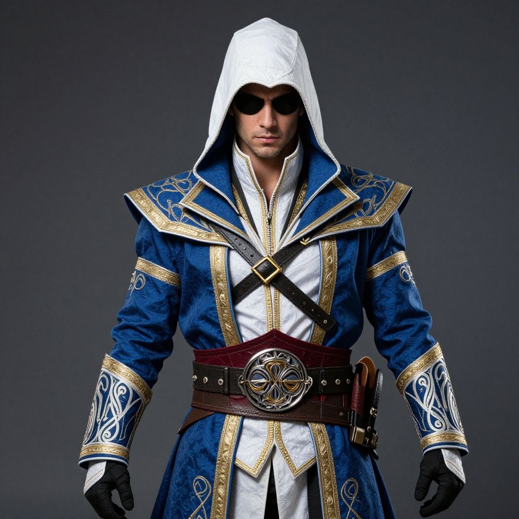 A man dressed in a highly detailed and realistic cosplay costume resembling Altair Ibn-La'Ahad, a famous character from the Assassin's Creed video game series. The outfit features rich blue fabric with gold and white intricate patterns, showcasing traditional Middle Eastern-inspired design elements in a dramatic and striking portrait.