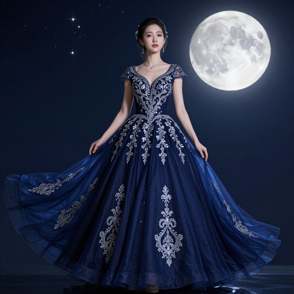 Cher moonstruck opera dress illuminated under a glowing full moon, intricate silver embroidery shimmering on deep midnight blue fabric, ethereal flowing layers, set against a celestial night sky with sparkling stars, cinematic and elegant fashion portrait
