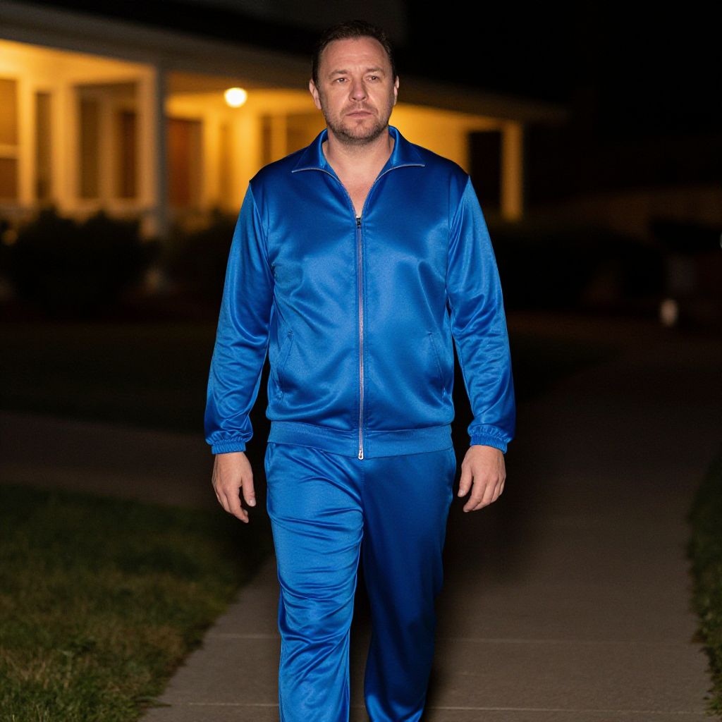 A man is dressed in a humorous one night stand costume, featuring a shiny blue tracksuit, standing outdoors at night with a house softly lit in the background. The photorealistic style captures his relaxed and confident expression as he walks along a dimly lit sidewalk.