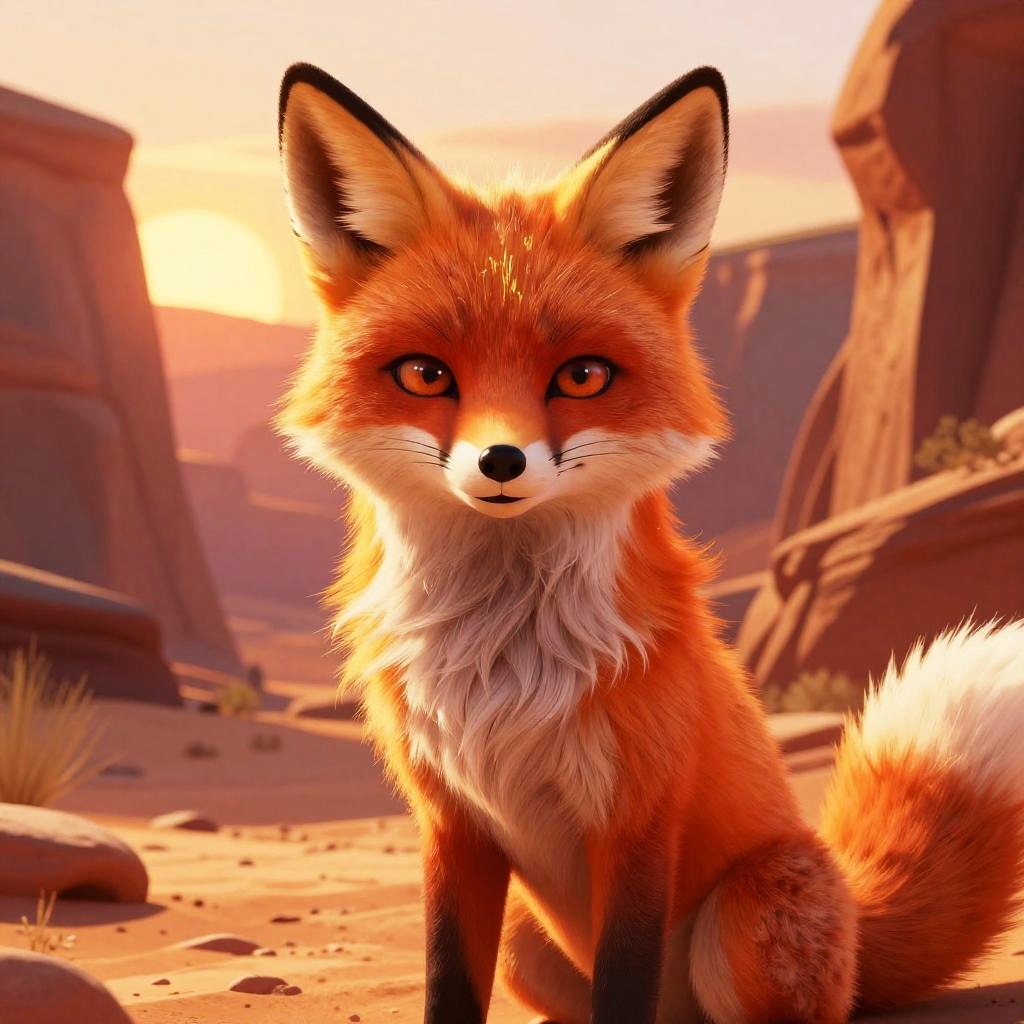 3D animated fox character in mid-air pose against a silver gradient background. The fox has bright orange fur with white belly and tip of tail, large expressive brown eyes, dark brown paws, and black-tipped ears. The character is depicted in a joyful flying motion with one paw forward and the other back.