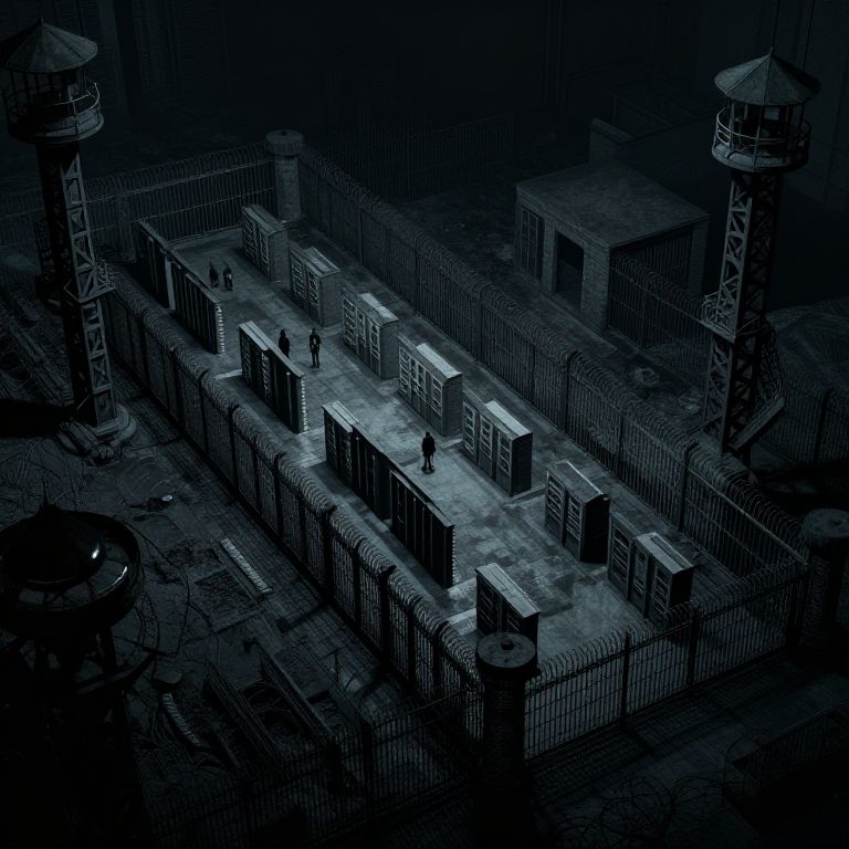 Prison floor plans dystopian concept, overcrowded cells, harsh environment, barbed wire fences, watch towers, dark tones, heavy shadows, cyberpunk inspired architectural illustration