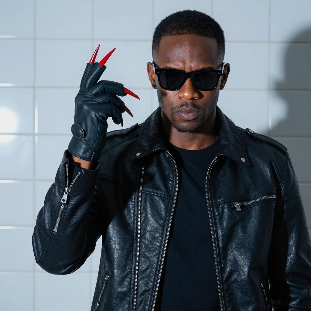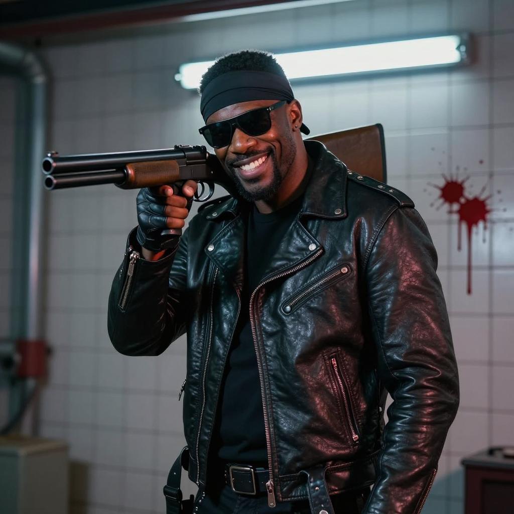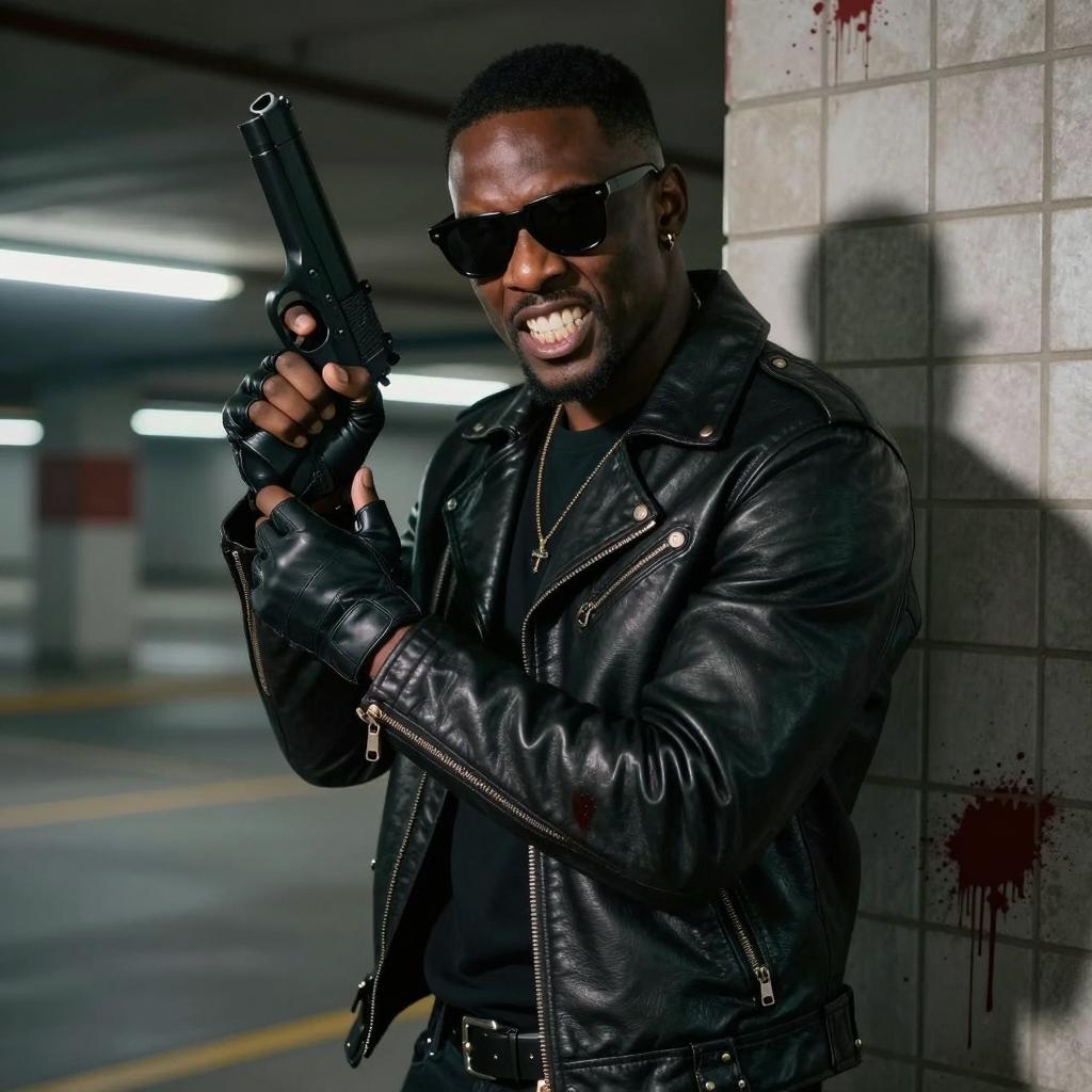 Muscular Black man with dark skin, short hair, wearing black sunglasses, leather jacket, black shirt, and black gloves. He is gripping a gun with his right hand, clenched teeth, intense expression. Background: dimly lit underground parking garage with blood splatters on tiled walls. Flourescent lights on ceiling, blurred red and blue hues. He stands in front of a tiled pillar.
