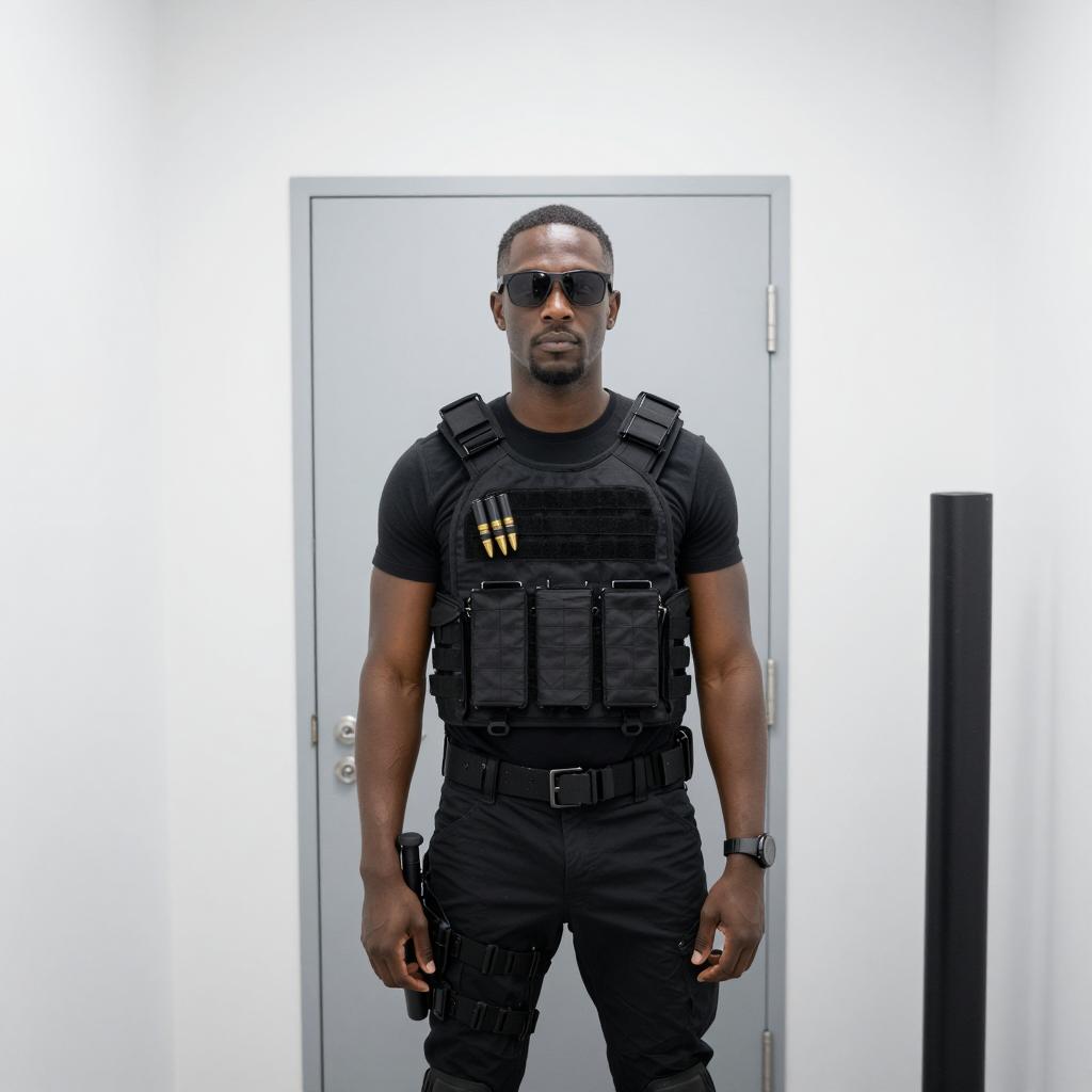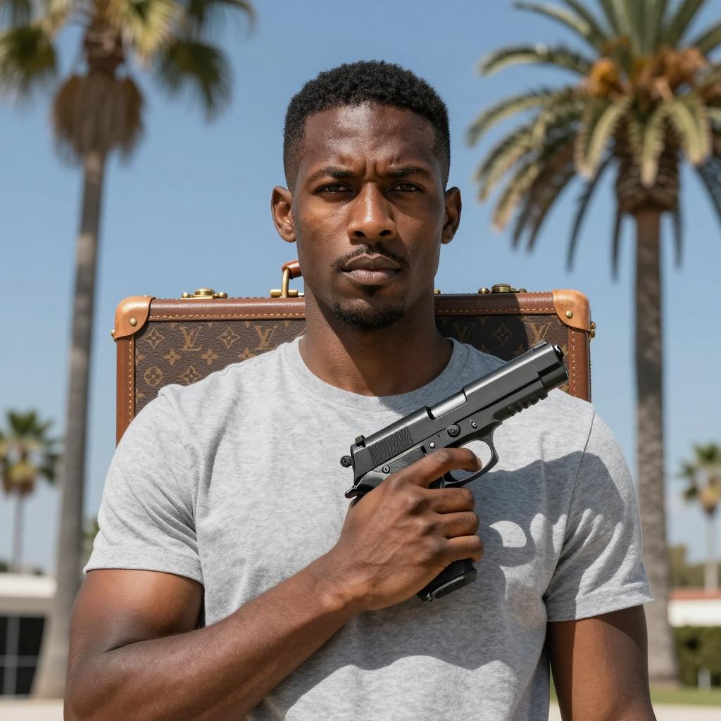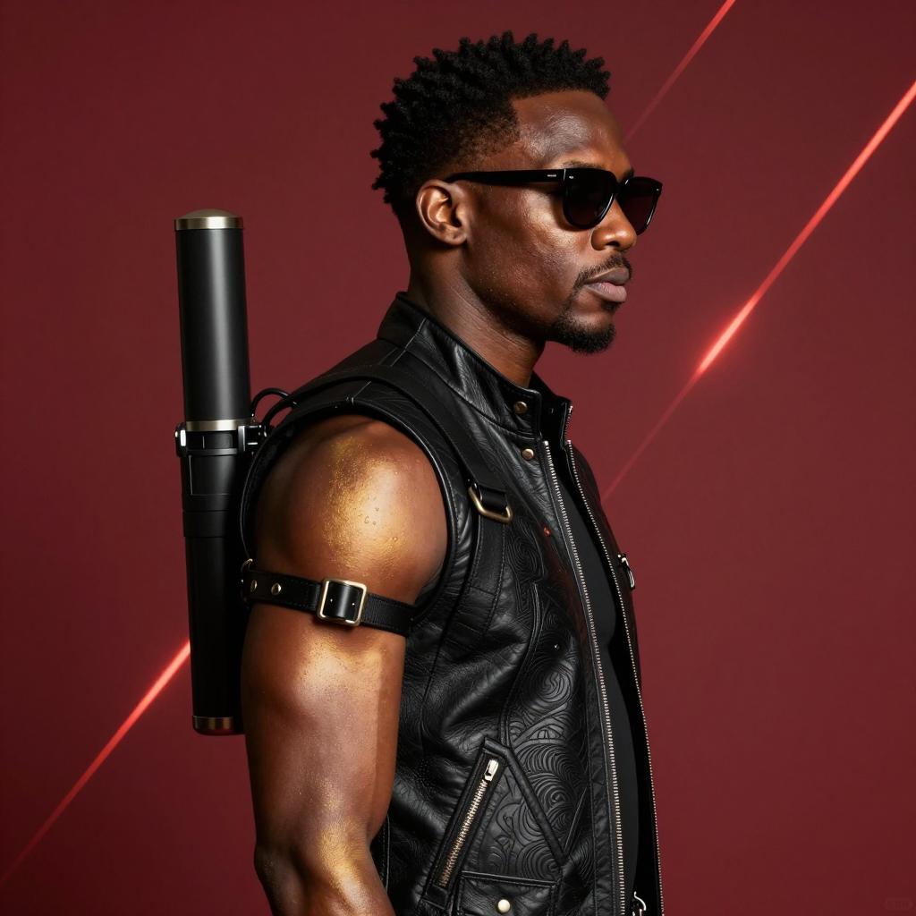 Muscular Black man with dark skin, short hair, wearing black sunglasses, leather jacket, black shirt, and black gloves. He is gripping a gun with his right hand, clenched teeth, intense expression. Background: dimly lit underground parking garage with blood splatters on tiled walls. Flourescent lights on ceiling, blurred red and blue hues. He stands in front of a tiled pillar.
